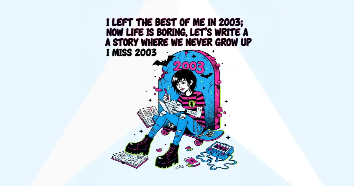 Lagu ini penuh dengan referensi nostalgia yang spesifik, seperti menyanyikan “New Found Glory” dan “The Anthem“. “2003” mewakili lebih dari sekadar tahun; itu adalah sebuah pikiran dan perasaan — masa muda, persahabatan, dan energi murni dari scene musik yang mereka cintai. Liriknya menangkap perasaan “tua dan di luar konteks”, merindukan kesederhanaan masa enam belas tahun sambil berjuang dengan kompleksitas kehidupan dewasa.