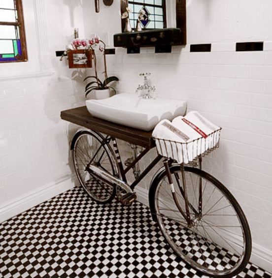 Sepeda bekas yang dibuang diganti dan dipadukan dengan counter top yang indah (terbuat dari kayu yang telah diselamatkan), wastafel modern, dan keran vintage.